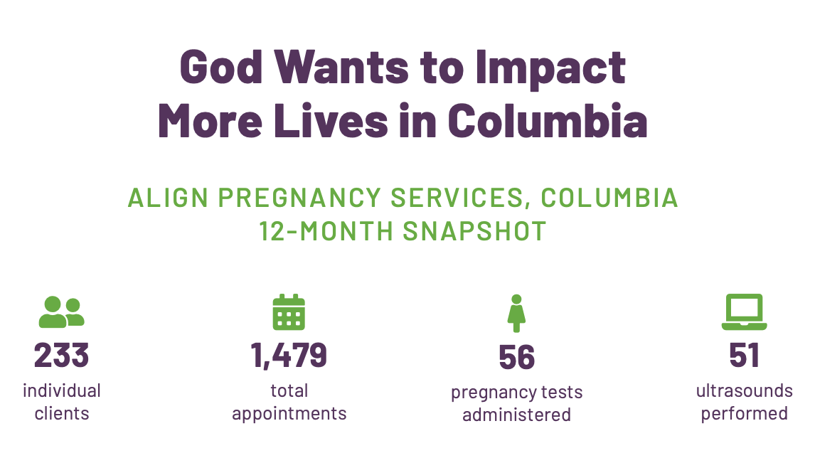 A young woman caught in sex trafficking had fled her captors and was in the Columbia area. She sensed God saying, "Go to Align Pregnancy Services. They'll help you." As she sat down with our director, she poured out her story, received prayer, and we referred her to local ministries dedicated to helping women in her situation.