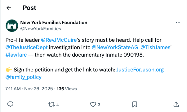 A new petition has just been launched at JusticeForJason.org, calling on Attorney General Pam Bondi to open a DOJ investigation into New York State Attorney General Letitia James for her role in the unjust targeting of Jason. When you sign the petition, you will immediately receive a link to watch the powerful documentary about Jason's story, Inmate 090198.